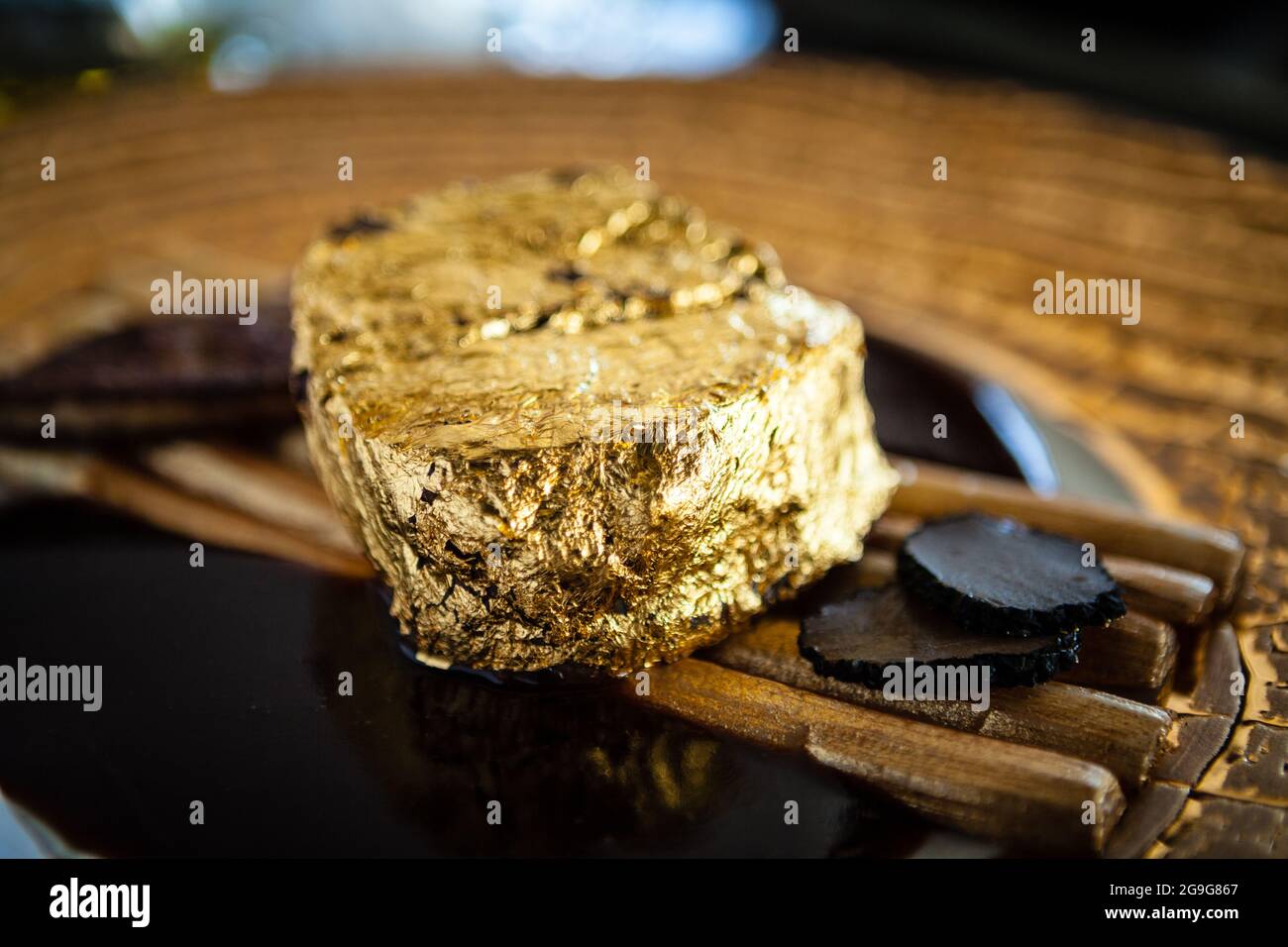Black Angus 24 Carat Gold Steak Beef Tenderloin Foie Gras Fresh Black Truffle White Asparagus Port Wine Sauce Delicious Food Closeup Served For Stock Photo Alamy